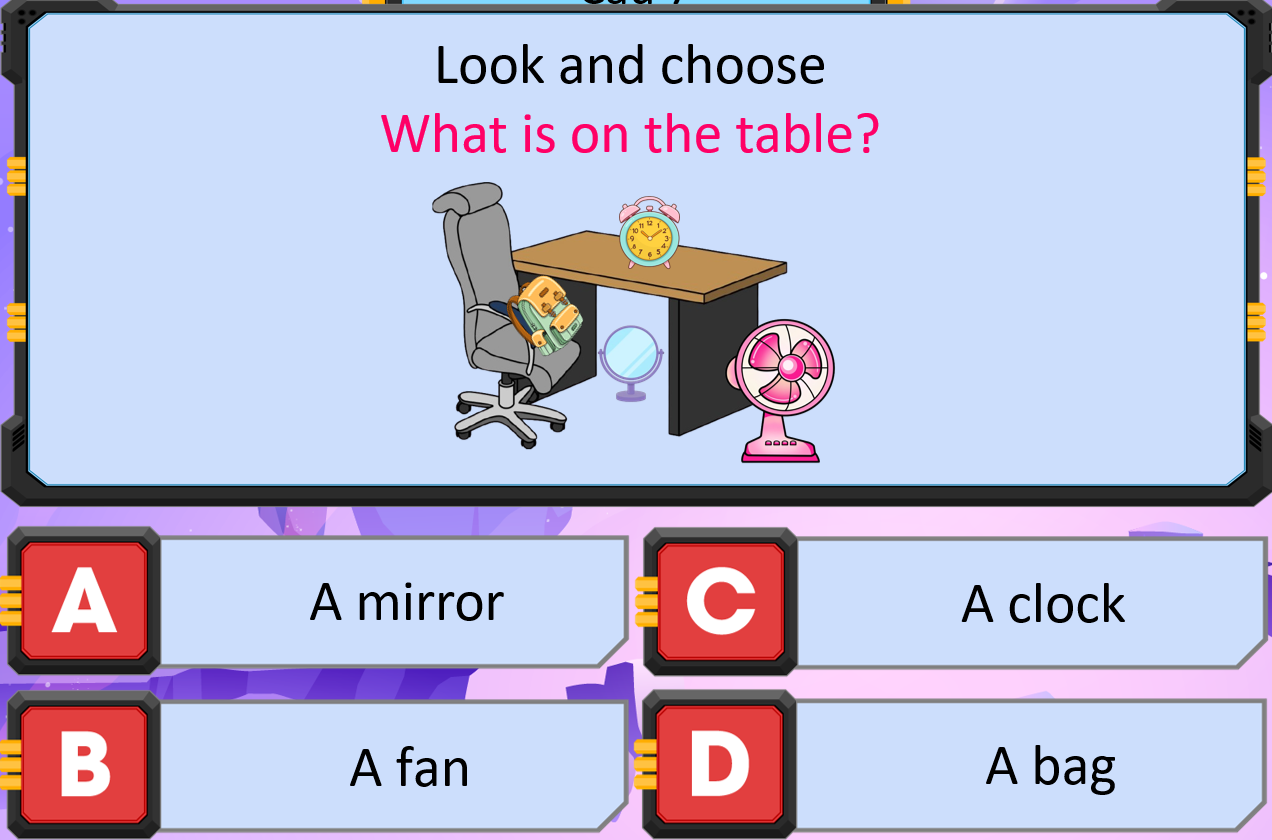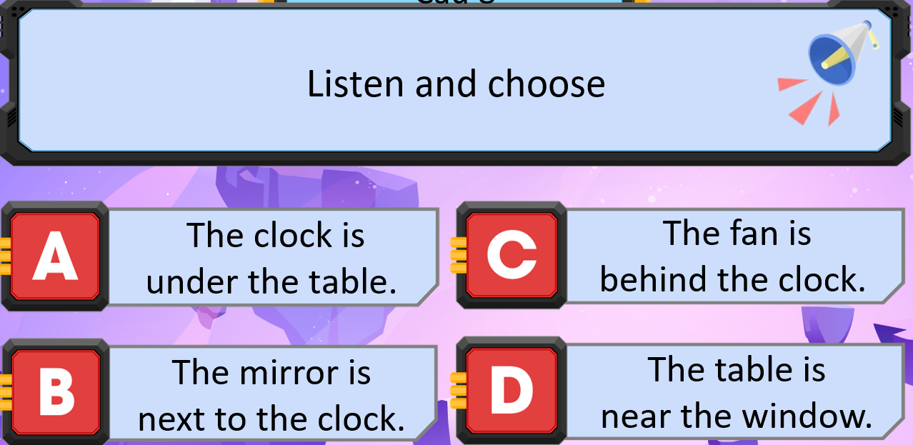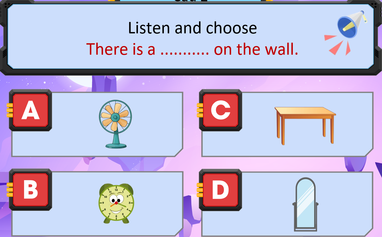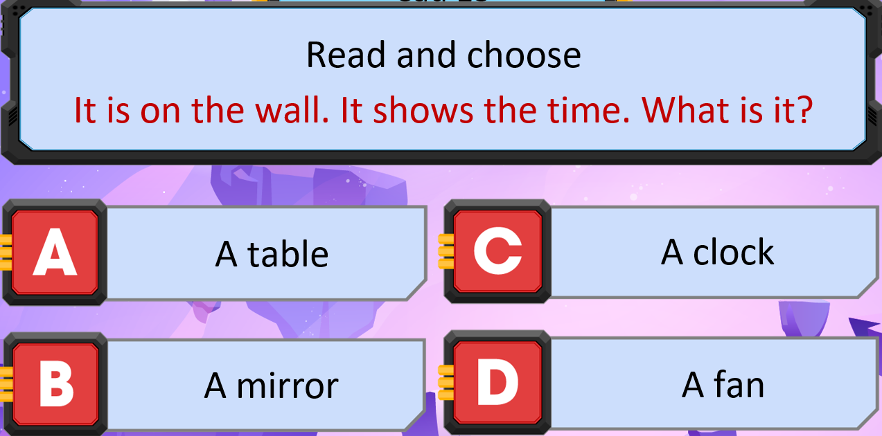Giải thích: It is on the wall. It shows the time. What is it?: Nó ở trên tường. Nó cho thấy thời gian. Nó là cái gì?