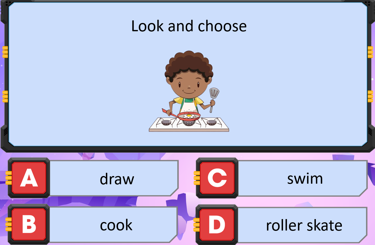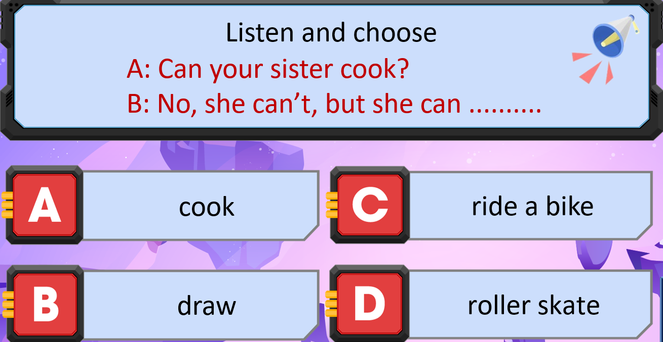 B: No, she can’t, but she can draw.: Không, cô ấy không thể nấu ăn, nhưng cô ấy có thể vẽ.