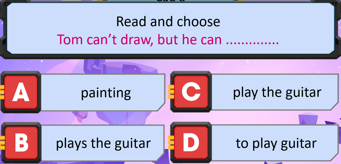 Giải thích: Tom can’t draw, but he can play the guitar.: Tom không thể vẽ, nhưng cậu ấy có thể chơi đàn ghi ta.