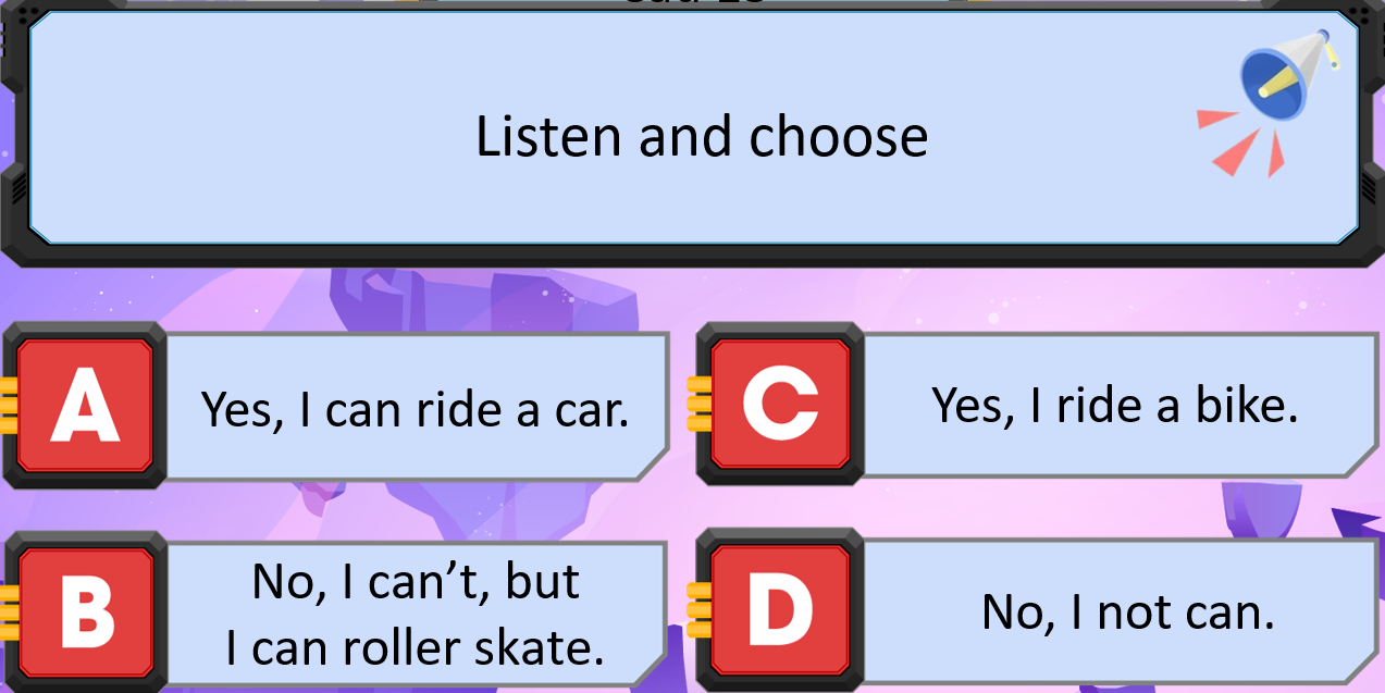 No, I can’t, but I can roller skate.: Không, mình không thể đạp xe đạp, nhưng mình có thể trượt patin.
